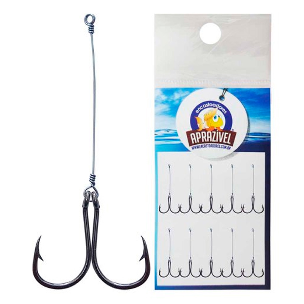 O formato proporciona maior aderência na boca do peixe e a tecnologia da Aprazível garante uma maior resistência e durabilidade do anzol. Além disso, o anzol é fabricado em aço e encastoado em inox com arame altamente rígido de alta qualidade, garantindo a resistência e a durabilidade do produto.