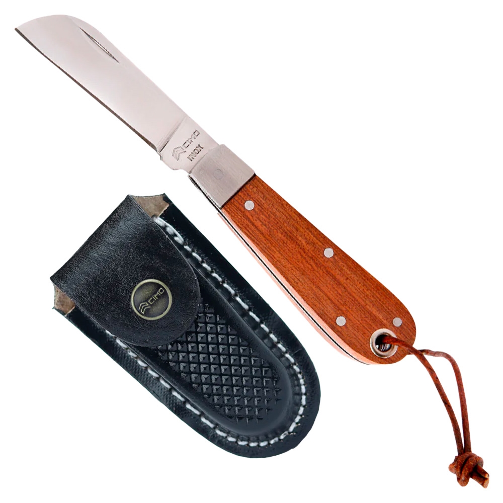 O Canivete Inox Cabo Madeira c/Cordão e Bainha 16/3 C/B - Cimo combina tradição, resistência e elegância em um design compacto e funcional, ideal para o uso diário. Produzido com aço inoxidável 420C, reconhecido por sua alta resistência à oxidação e excelente retenção de fio, este modelo oferece corte preciso, durabilidade excepcional e desempenho superior em qualquer situação.