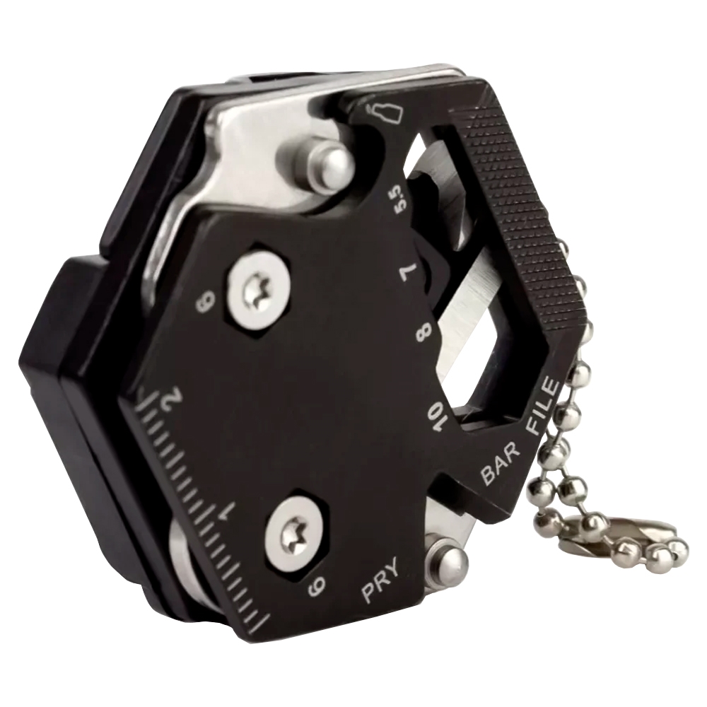 Com 14 funções integradas, este chaveiro multifuncional é ideal para quem gosta de estar sempre preparado. Ele conta com ferramentas essenciais como abridor de garrafas, lâmina de corte, chaves de fenda e Phillips, chaves hexagonais, régua, lima, cortador de linha e até cortador de cinto de segurança, sendo um aliado indispensável tanto no uso urbano quanto em atividades outdoor.