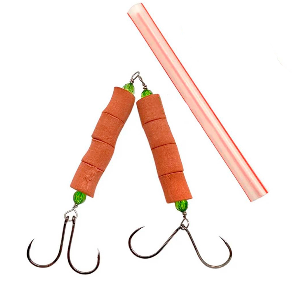- Material: Arame de aço inox, flutuadores em EVA, miçangas plásticas e anzol duplo chinu