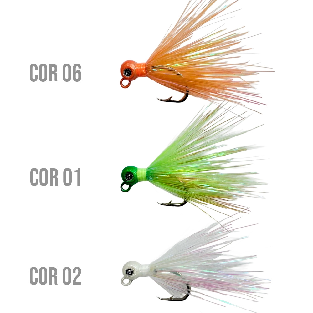 Fabricada com cabeça de metal e cerdas de alta qualidade. O Jig Micro é uma isca do tipo “hair jig” (jig de penacho), possui corpo compacto, ação sinking (afundante) e um anzol reforçado integrado ao corpo.