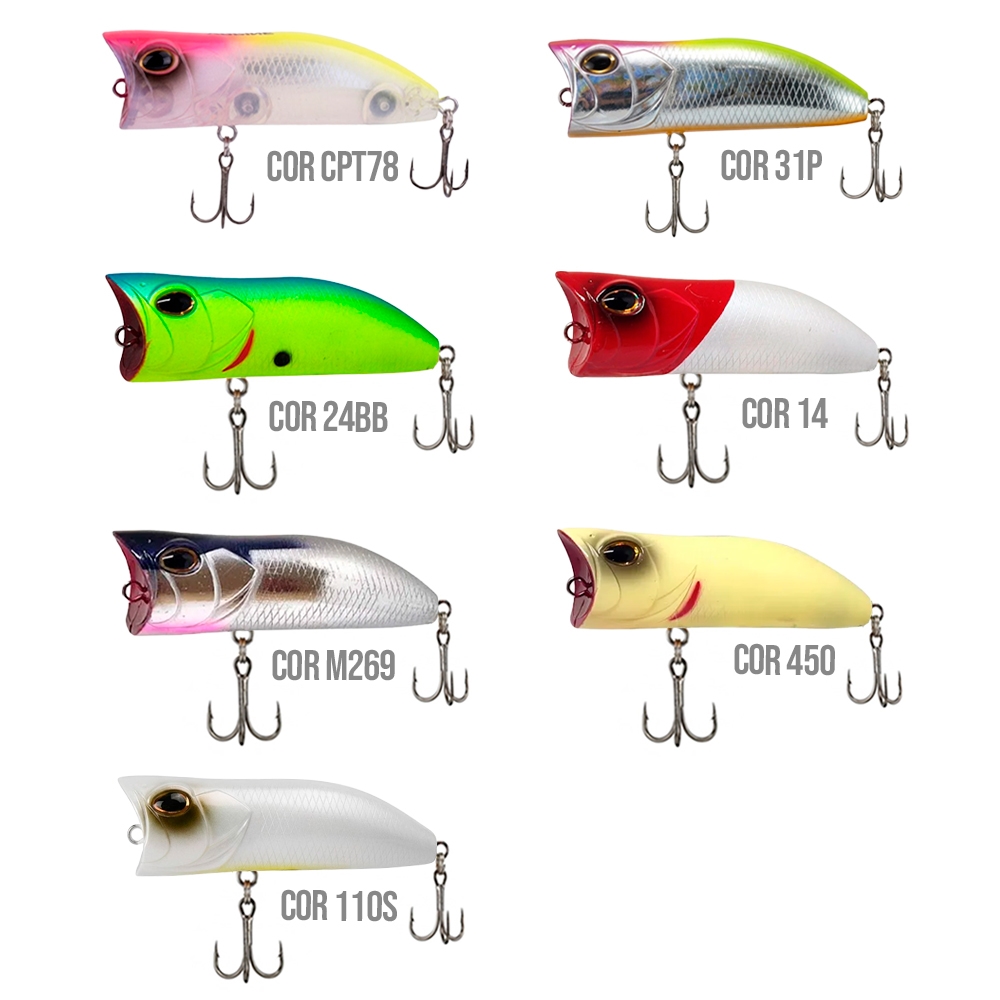 As Isca Artificial RAM POPPER é uma isca de superfície que produz um forte som na água, atraindo os predadores com facilidade, ela é produzida em Plástico ABS e Aço de alta resistência, Contém Rattlin (Efeito sonoro) e são equipadas com garatéias Owner