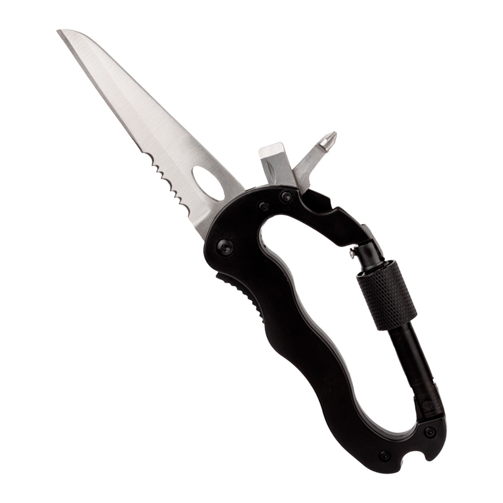 Além da função tradicional de mosquetão, este modelo se destaca por integrar lâmina serrilhada, chave de fenda, chave Phillips e abridor de garrafa, tornando-se uma ferramenta multifuncional indispensável para uso outdoor, emergências leves e tarefas do dia a dia.