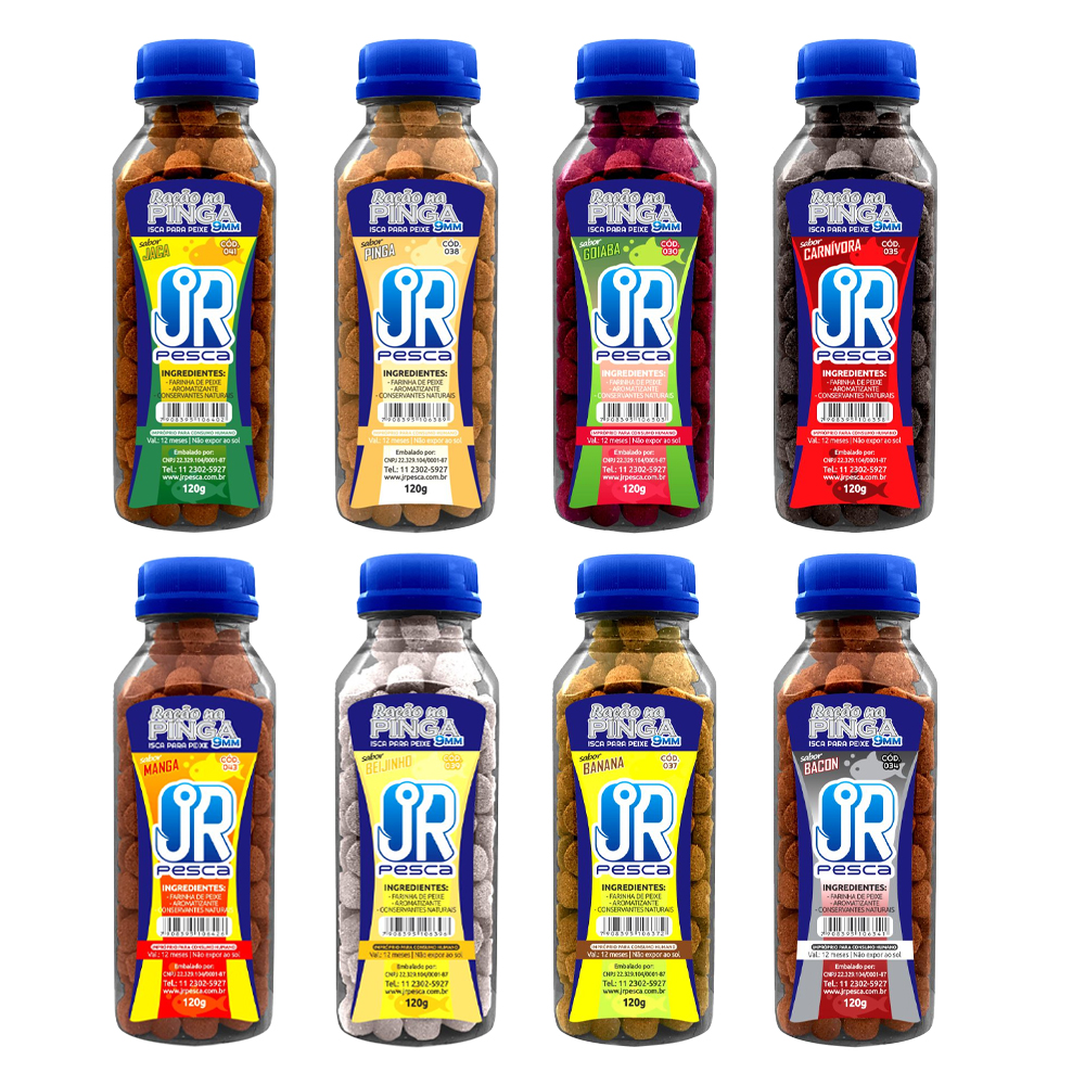 A Isca Ração para pesca na Pinga - JR Pesca está disponível nos sabores: Banana, Bacon, Goiaba, Beijinho e Carnívora.