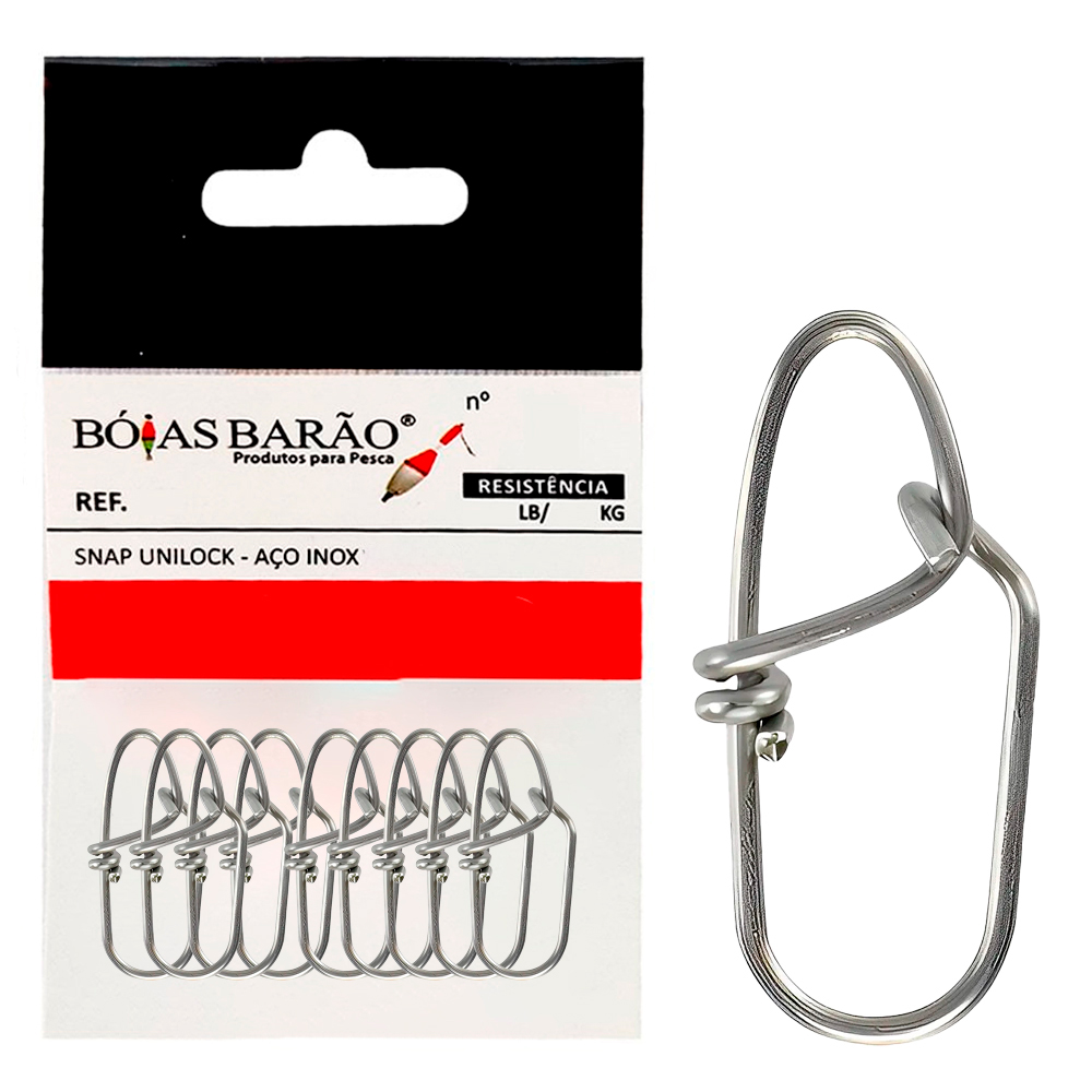 Apresentamos o Snap Unilock Aço Inox 0,90mm 10un da marca Bóias Barão, utilizado para prender a Isca Artificial que permite a troca rápida da isca principalmente nos dias que a pescaria não está tão produtiva.