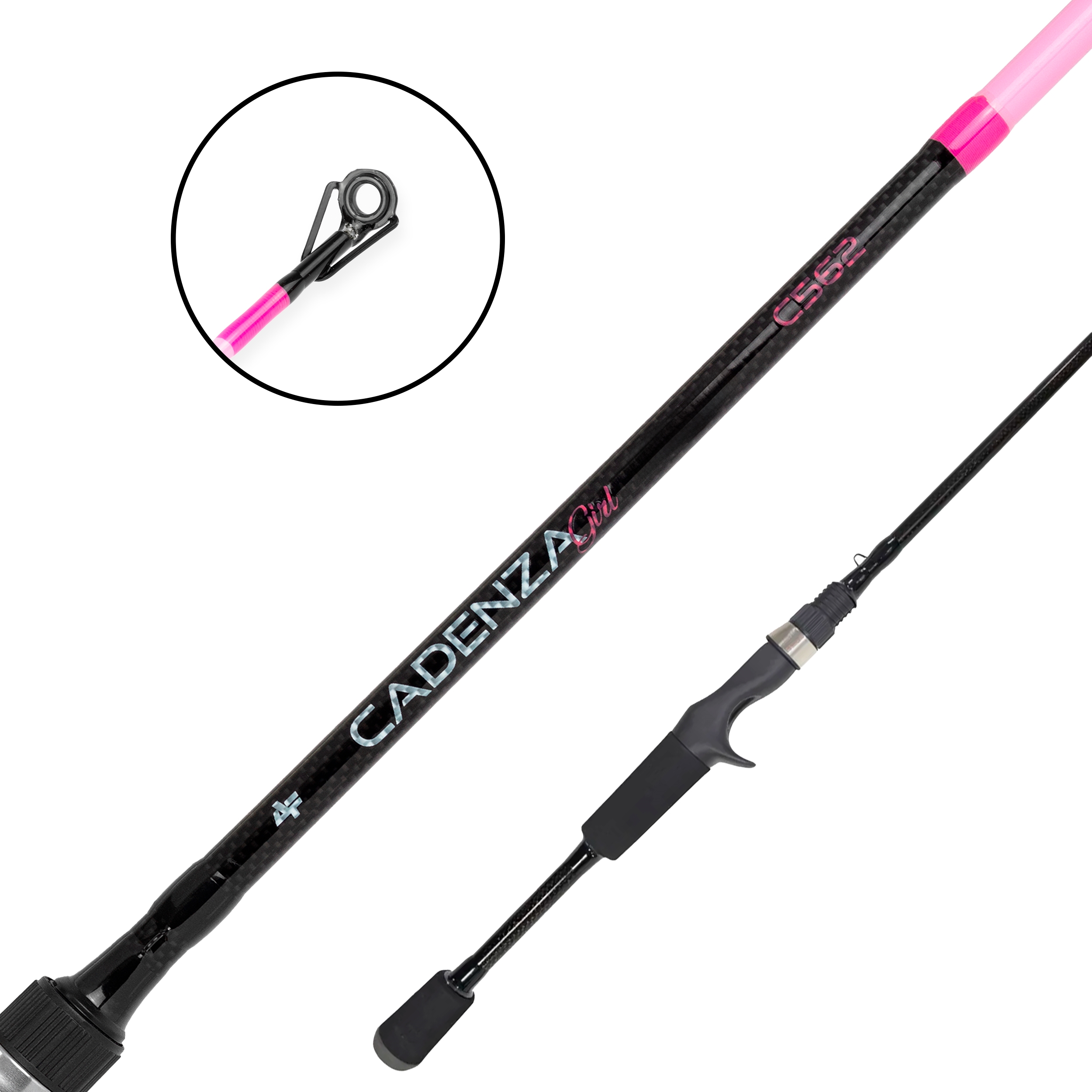 • Vara Cadenza Girl: 1,70m | Passadores: 1 (Pata dupla) + 3 (Pata simples) + 1 (Ponteira) | Ação: Rápida | 10-20 Lbs; | Peso: 115g | 2 Partes | Casting: 14g a 28g | Cabo: 20cm